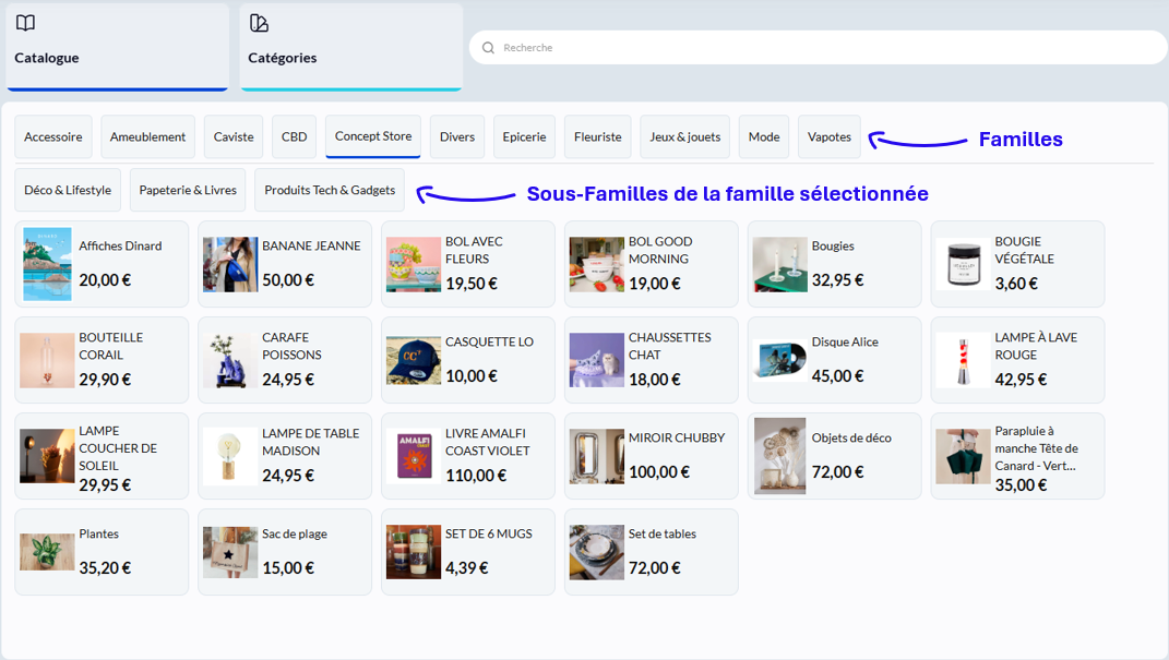 - Nous recommandons d’éviter d’utiliser un trop grand nombre de sous-famille par famille et d’utiliser des mots ou groupes de mots clairs, simples et précis (exemple: “Homme”, “Vaisselle”, etc.)
