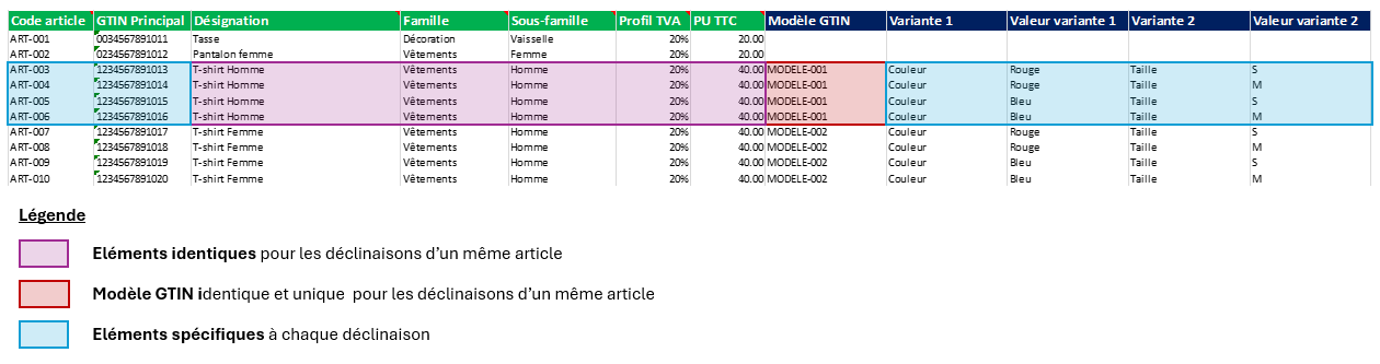 - Exemple: L’article “T-shirt” possède les variantes “Taille” (en S et M) et “Couleur” (en Rouge et Bleu). Le fichier comporte les 4 lignes suivantes: T-shirt Rouge S, T-shirt Rouge M, T-shirt Bleu S, T-shirt Bleu M. Dans la colonne Modèle GTIN, toutes les lignes ont la valeur “MODELE-001” car chaque ligne correspond à une déclinaison de l’article T-shirt